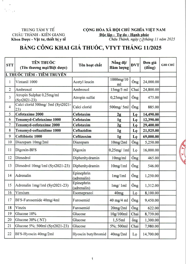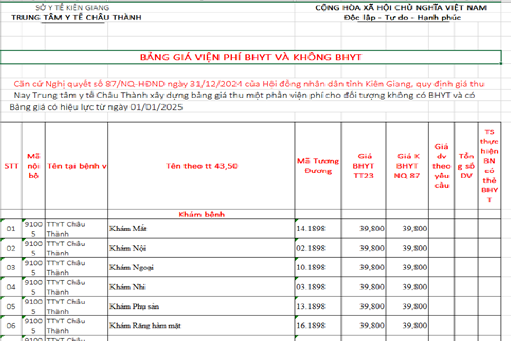 Trung tâm y tế Châu Thành xây dựng bảng giá thu một phần viện phí cho đối tượng không có BHYT và có BHYT như sau: